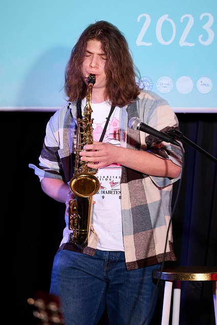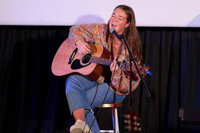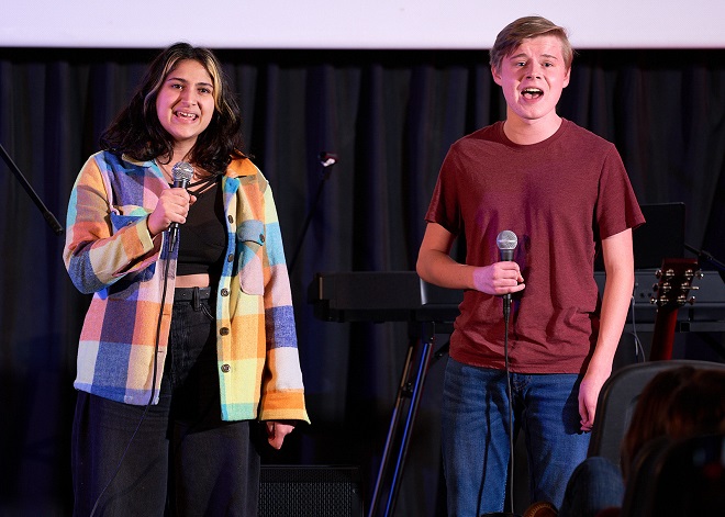 Eighteen students signed up to take part, and each performance brought a different mood to the theater. First up, junior Gwen Kirst gracefully took on the folksy range of high notes in "Curses" by the Crane Wives. Soon after, junior Jack Pasquale sang the Neil Diamond classic "Sweet Caroline," and the crowd couldn't help but join in. Sophomore Daniel Visconti played the saxophone, using his playful facial expressions to connect with the audience. Freshman Peyton Levine chose the ballad "Hopelessly Devoted" from Grease. Her mom, Ami Schmitz, spoke for all parents in the audience when she said she felt a combination of nerves and pride.