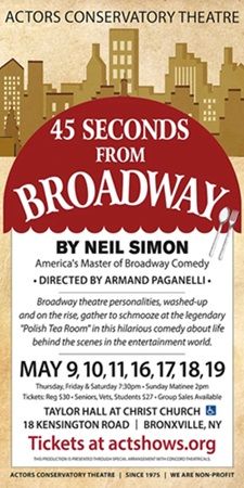 May 2, 2024: Actors Conservatory Theatre will present 45 Seconds From Broadway at Christ Church Bronxville on May 9, 10, 11, 16, 17, 18 and 19. CLICK HERE to purchase tickets.