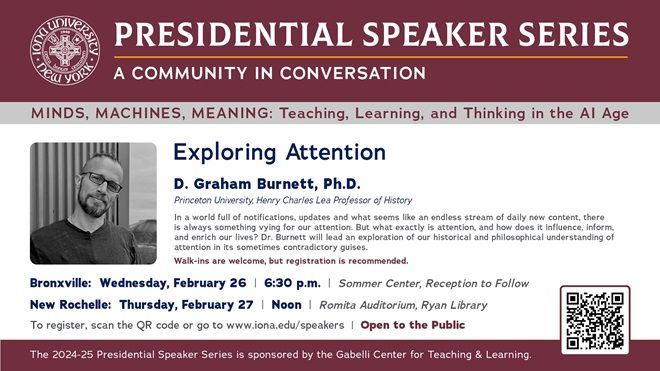 Feb. 5, 2025: In a digital age dominated by constant notifications and distractions, understanding the power of focused attention has never been more critical. Iona University is proud to host D. Graham Burnett, Ph.D., a distinguished scholar and leading thinker on the human dimensions of attention and its current crisis, to explore these important themes.
