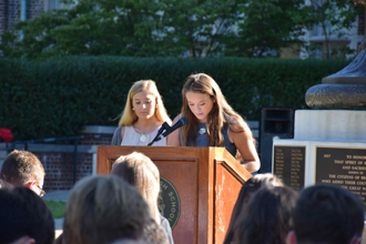 Bronxville High School seniors Lilly Harbin and Grace Stephens addressed their classmates during a memorial tribute for the victims and heroes who lost their lives on 9/11.