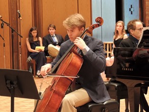 Instrumentalists presented pieces from several style periods. Dryden Quigley played Johann Pachelbel's Canon in D major on the harp. Cellist Henry Anderson offered Après un rêve, Opus 7, No. 1 by Gabriel Fauré and later joined violinist Hilary Rizzo and Caroline Schetlick on piano for Primavera Porteña by Ástor Piazzolla. Lauren Gray and Amy Kwok presented a more contemporary offering with their piano duet of Death by Glamour by Toby Fox.