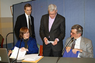 Pictured here: Seated: board president Denise Tormey (L) and Superintendent Dr. David Quattrone; standing: board member David Brashear (L) and board vice president Jeff Rohr.