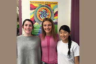 Pictured here (L to R): Bronxville High School students Georgia Lazaroni, Carlie Hoffer, and Hiroko Mitsui, who earned top honors from Scholastic Art and Writing Awards.