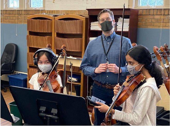 Pictured: Middle school students and teacher using a portable recording studio in orchestra, courtesy of a Foundation grant. L to R: Sophia Ikiri, Wyeth Tvenge and Kiran Madhavan.