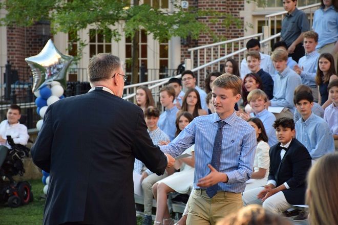 The ceremony opened with a processional to “Over the Rainbow” by Harold Arlen as the students marched together before an audience of friends, family, teachers and administrators. Principal Dr. Thomas Wilson welcomed the guests and honorees before six student representatives – Kailee Fino, Harry Gallo, Linnea Hentschel, Jack Preusse, Gracie Scagnelli and John Toal – shared their reflections on the past three years.