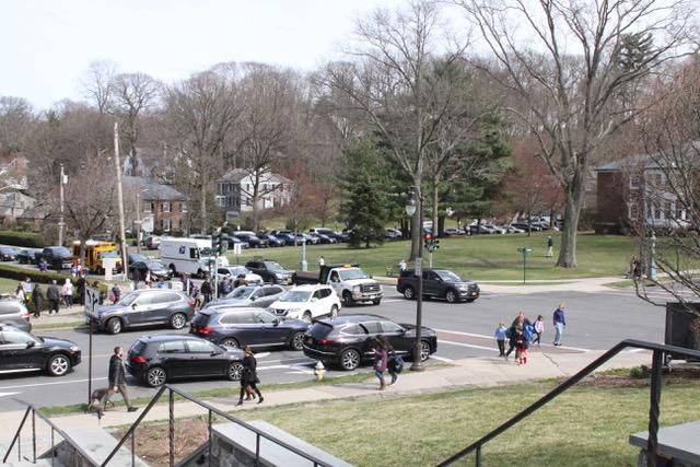 These lines form on Midland Avenue, Pondfield Road, and Meadow Avenue at the end of the school day as students stream out of the school, walk along sidewalks, get into cars, and cross at various intersections as they head home or on to their next activity.