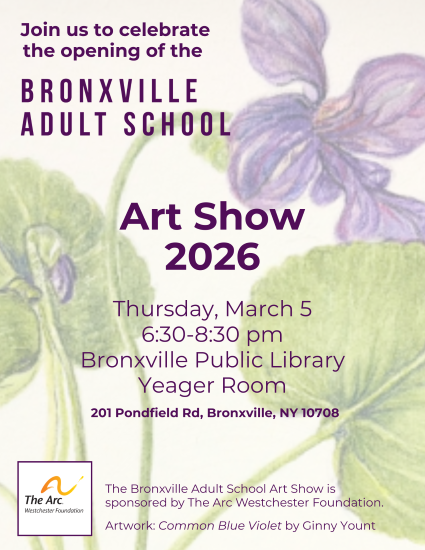 March 5, 2026: Please join the Bronxville Adult School for the opening of its Art Show 2026 at the Bronxville Public Library's Yeager Room. Artworks by students and instructors will be on display for the month of March during the library's regular business hours.