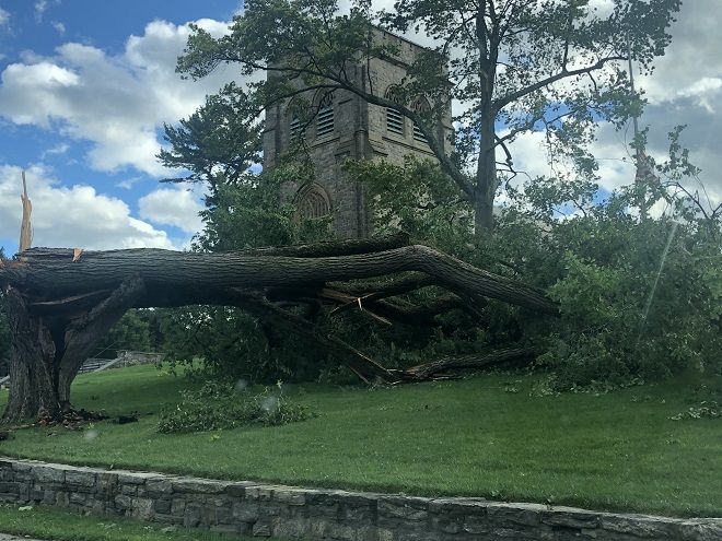 Aug. 5, 2020: Tropical Storm Isaias blew through Bronxville yesterday, August 4, leaving large downed trees and powerlines in its wake. A huge tree in front of the Reformed Church of Bronxville (picture above) fell along with other trees and branches in Bronxville.