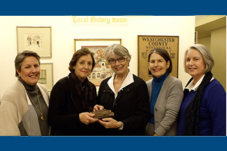 Pictured here: William A. Bates's four grandnieces deliver the architect's 20th-century sketchbooks to the Bronxville History Center. From left, Sarah Wells Macias, Marianne Wells, Bronxville Village historian Eloise L. Morgan, Katherine Wells Power, and Nancy Wells Warder. Bates was Bronxville’s leading architect between 1890 and 1922.