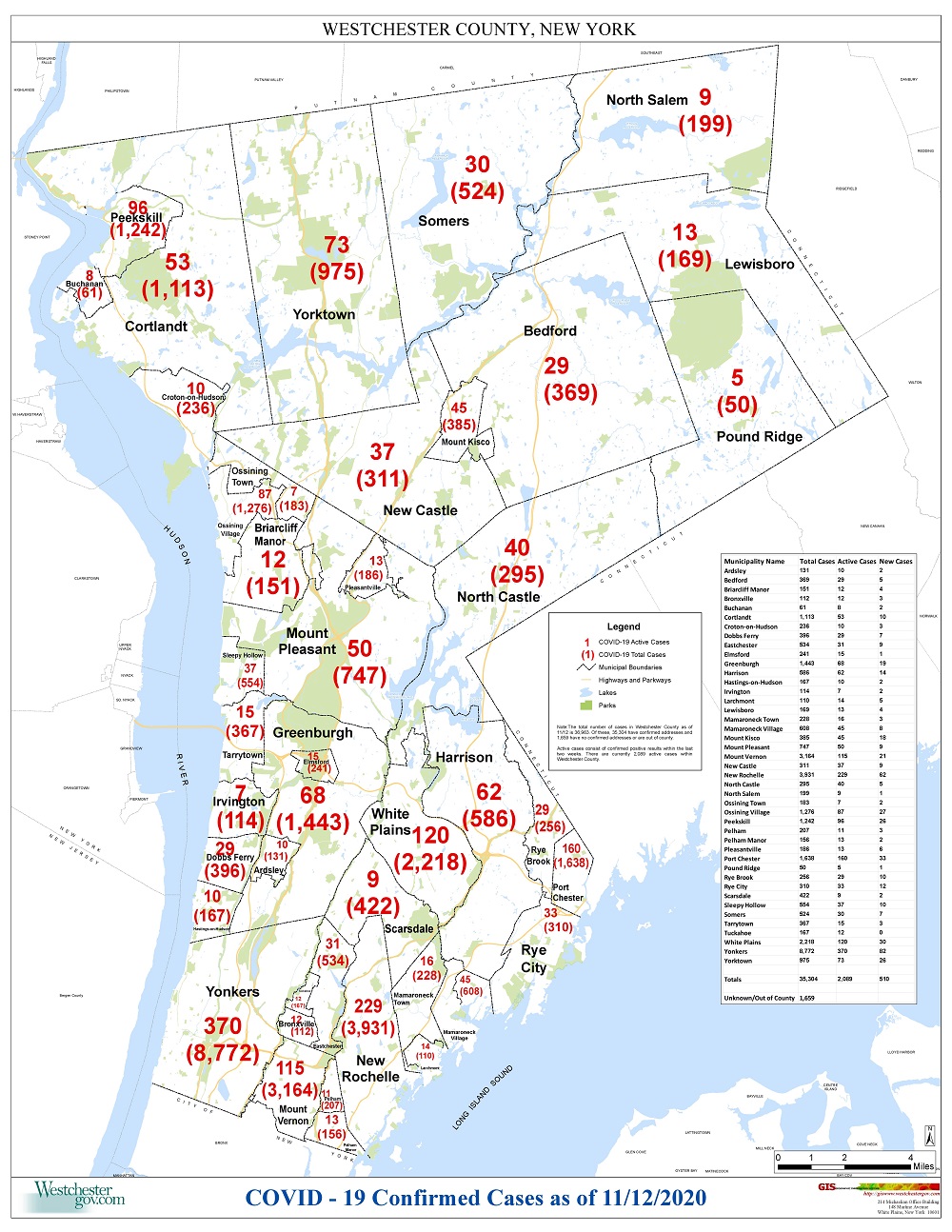 Updated Nov. 12, 2020: The Westchester County COVID-19 map now shows 12 active cases in Bronxville and 112 total cases. See map below. To put this in context, a month ago (October 15), Bronxville had 2 active cases.