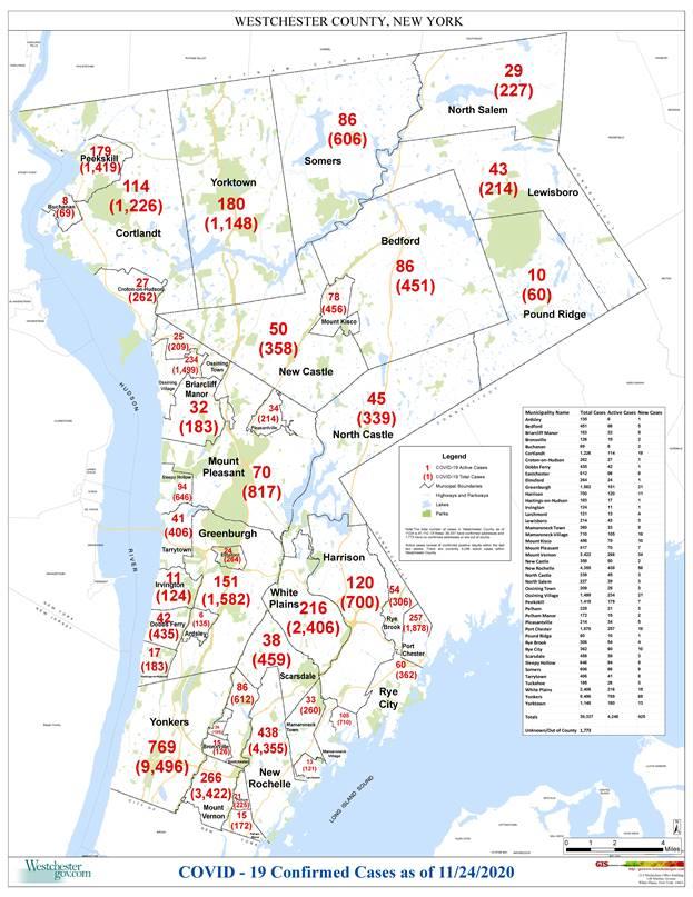 The Westchester County COVID-19 map for November 24 shows 15 active cases in Bronxville and 126 total cases. A month ago (October 15), Bronxville had 2 active cases.