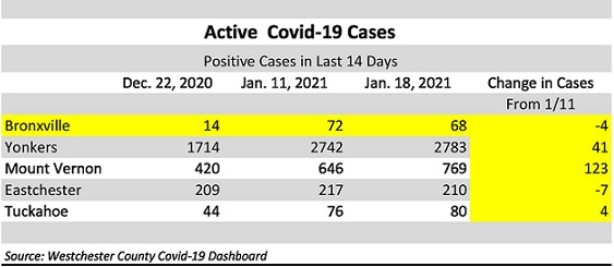 According to the Westchester County Covid-19 Dashboard, as of January 18th, there were 68 active Covid-19 cases in Bronxville.  While this is fewer than on January 11th, cases are still up dramatically from the pre-holiday total of 14 cases.  Covid-19 cases in Yonkers, Mount Vernon, and Tuckahoe continue to rise. Cases in Eastchester declined this week.