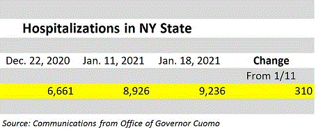 Total hospitalizations in New York State for Covid-19 continued to increase this week. As of January 18th, 2021, there were 9,236 hospitalizations in New York State, up 310 from last week.  Of these hospitalization, 1,614 were in the ICU.