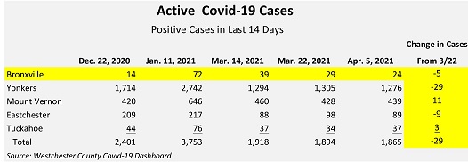 Apr. 7, 2021: Covid-19 cases in Bronxville have fallen over the past couple of weeks from a total of 29 on March 22 to 24 on April 5, 2021. In total, cases in Bronxville and nearby are down by 29 from March 22, 2021 to April 5, 2021.