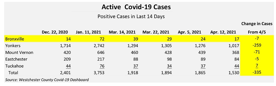 There are still a total of 1,530 cases in Bronxville and nearby towns, including Yonkers, Mount Vernon, Eastchester and Tuckahoe. However, total cases are far below the January holiday spike when total cases in these towns hit 3,753 on January 11, 2021. Click here to view the Westchester Covid-19 tracker.