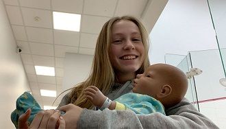 I was one of these high schoolers, and I was carrying around a baby, but not a real one. She was a "digital baby" named Riley, and she was programmed to cry when she needed a diaper change or was hungry or just fussy. This experience is part of the required "Health" class for Bronxville High School.