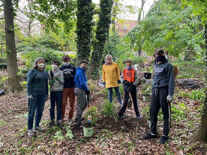 In April, the Boulder Ledge Garden Club and students and parents from the Middle School Character and Community Committee (MSCC) held a spring clean-up of the park. At that event, some volunteers noticed that the park was overrun with invasive species and contacted the Bronxville Green Committee. Since then, the Green Committee, MSCC, Boy Scouts, and Girl Scouts have joined forces to remove invasive plants and replace some of them with pollinator-friendly native plants that they hope will become part of a "pollinator pathway" supporting birds and insects in the local food web.