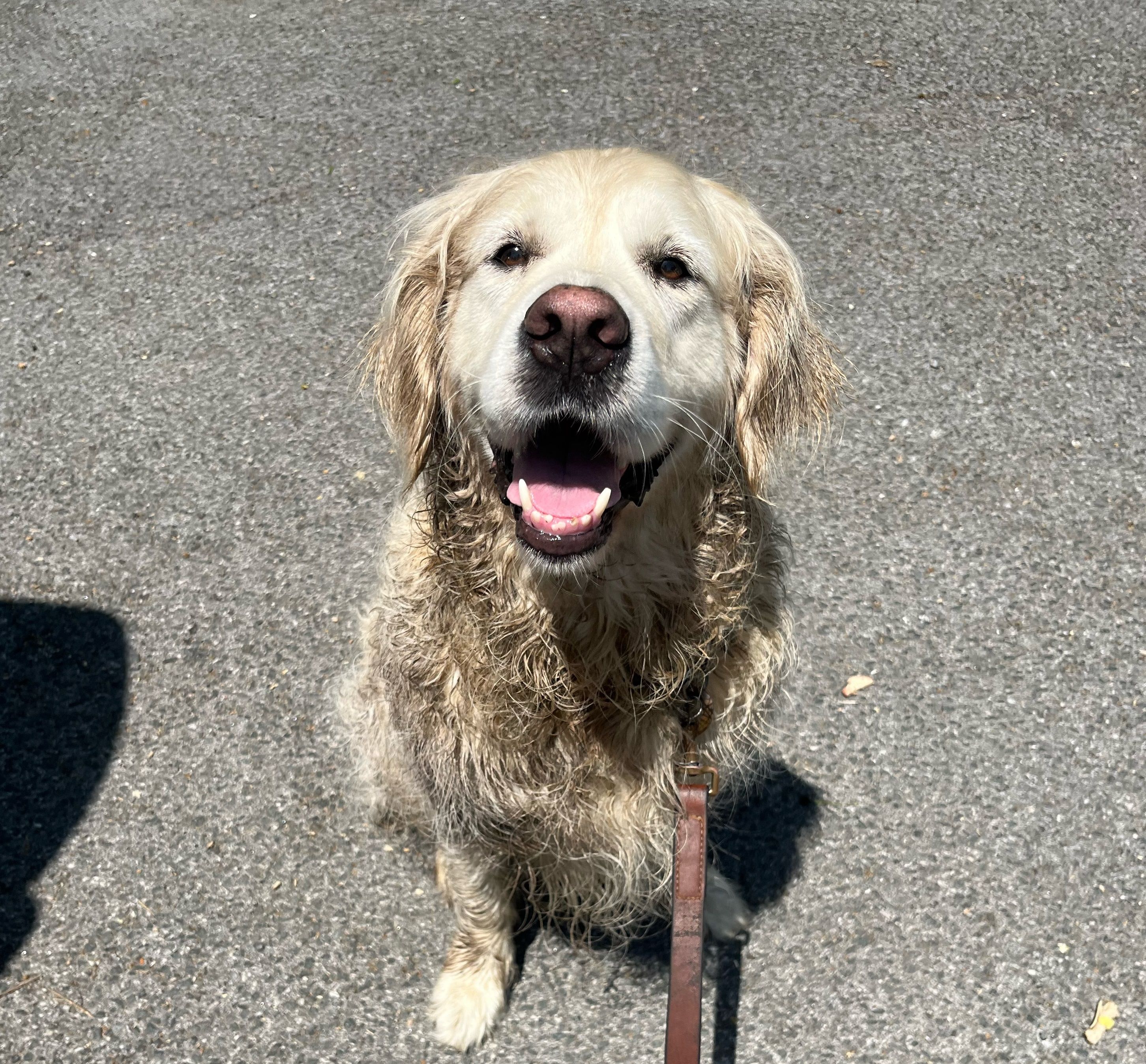 Donna says she was at the Scout Field dog park when Arlo followed his nose searching for food and disappeared into the dense underbrush along the river. She says that "he clearly went for a swim too!"