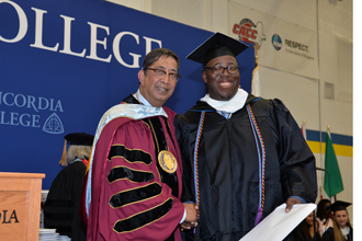 Pictured here: Top photo: President Viji George at graduation with Davin Thompson-Williams, 2016 recipient of the Good Shepherd Award; bottom photo (L to R): Neil Tarangioli, Concordia men's tennis coach; 2015 Good Shepherd Award winner Dagyeong Yang; and Guy S. Longobardo.