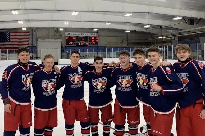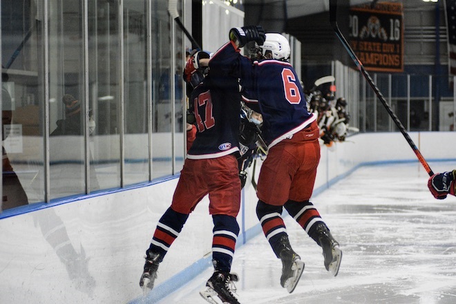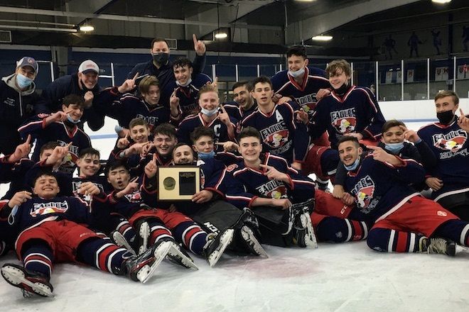 After the goal by Dillon, the Eagles went on to take a 2-1 lead with a goal from junior Will Stupart, and then scored again when Luke Arrighi scored on a loose puck right after Pat Dodson had taken a shot for the Eagles. A final goal by Dillon with an assist from his co-captain, Earl Gretzinger, led the Eagles to a 4-1 victory celebration. Eastchester’s JP Rosabella, a senior goalie, had 20 saves in the game.
