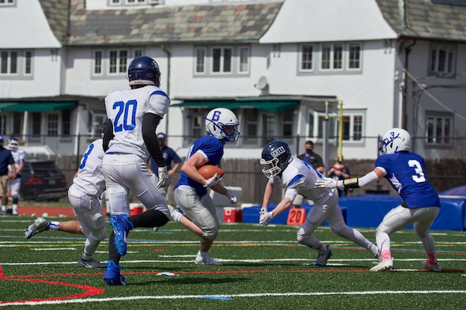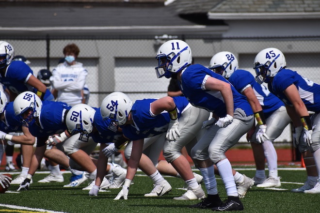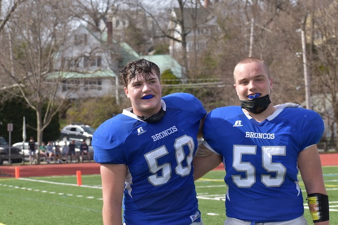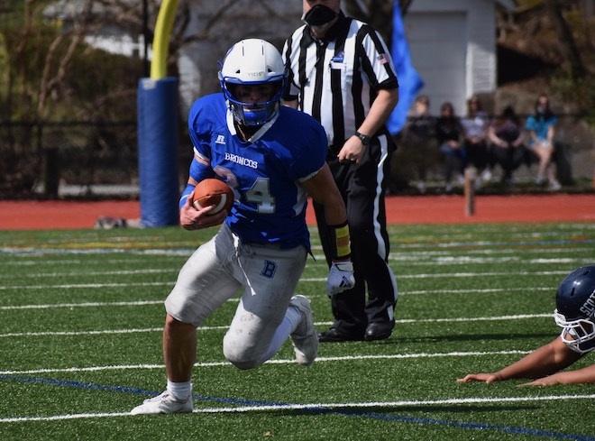 Mar. 31, 2021: After last week’s 28-0 shutout against Class C defending champion Valhalla, the Bronxville football team continued to dominate again this week. In their home opener on Saturday, the Broncos scored five touchdowns against Dobbs Ferry in the first half and held the Eagles scoreless until the fourth quarter. The final score was 48-7.