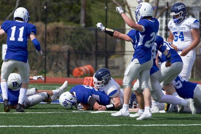 Preston Maze (56) recovers a fumble in the game against Dobbs Ferry. Photo by David Fenner.