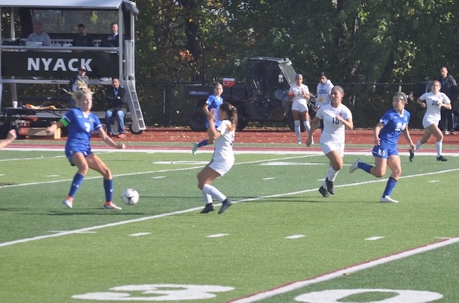 In the playoff game held at Nyack High School on Halloween, the Broncos took an early 1-0 lead with a goal by Lily Jebejian. In that score, Molly Krestinski collided with the keeper causing the ball to be rebounded, and Jebejian took the rebound and found the back of the goal. The Broncos scored three more times with two goals by midfielder Alice Vranka, who had been moved from her usual position at center back, and the 4th and final goal by Kiki Tormey who kept relentless pressure on the Bears’ keeper.