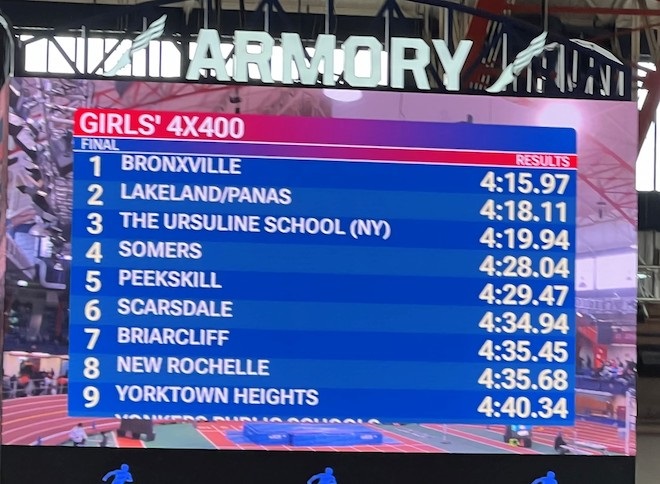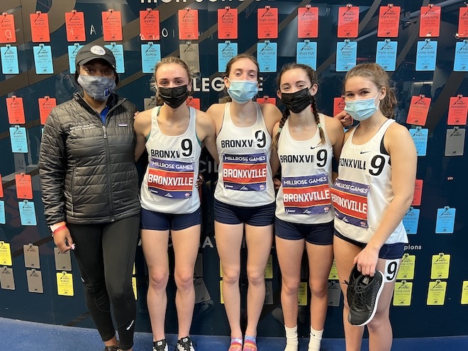 Feb. 2, 2022: During the blizzard on Saturday, two relays from the Bronxville girls’ track team headed to The Armory to compete in the 114th Millrose Games. Bronxville relay teams often qualify for this prestigious track event, but last year the Millrose Games were canceled because The Armory became a vaccination site.