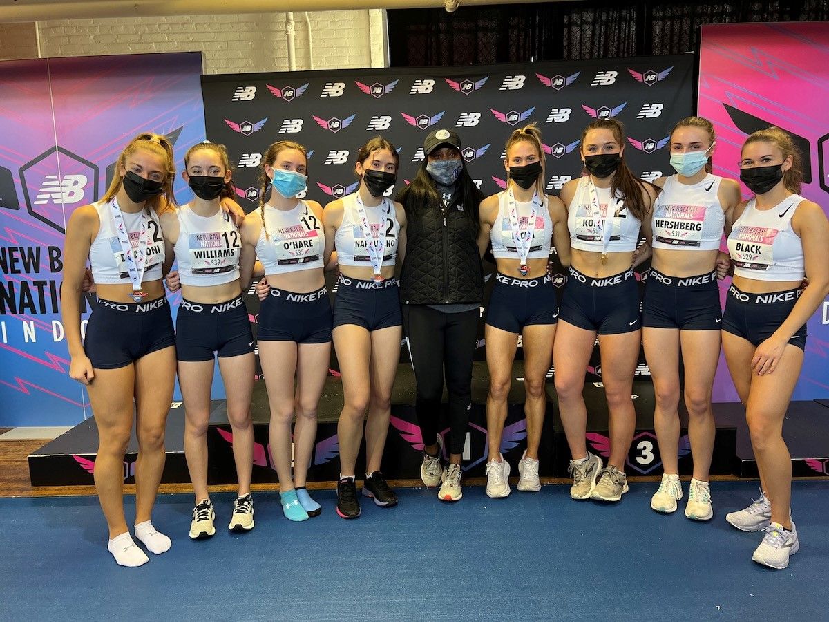 The Bronxville girls with Coach Keina Samuels at the Nike Indoor National Championships. Photo by J. Ircha.