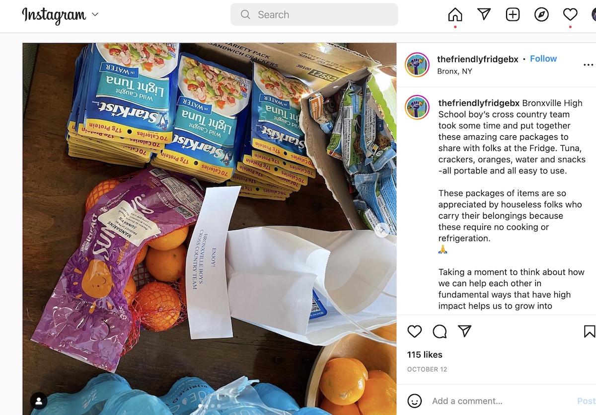 “Our team has been making care packages at our weekly team dinners and delivering them to the Community Fridge near Van Cortland Park,” said Coach Jim Agnello.