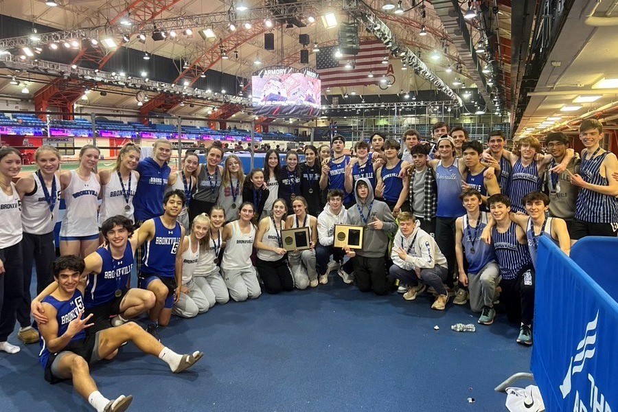 The boys’ and girls’ indoor track and field teams holding their Sectional Championship plaques. Photo courtesy of @bxvboystrack.