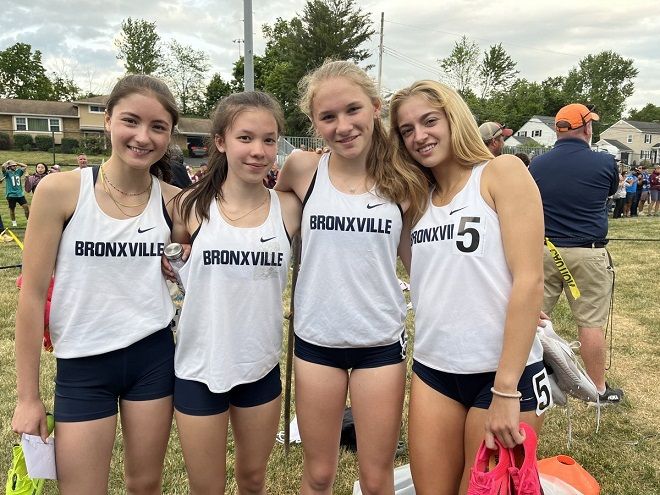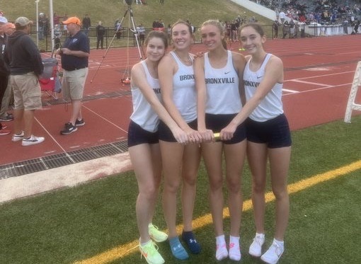 The Bronxville girls after winning the 4x400m relay at the New York State Championships. Photo courtesy of @bxvboystrack.