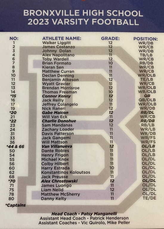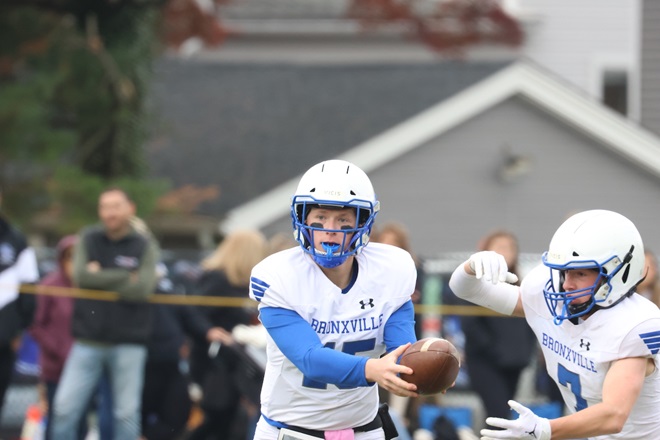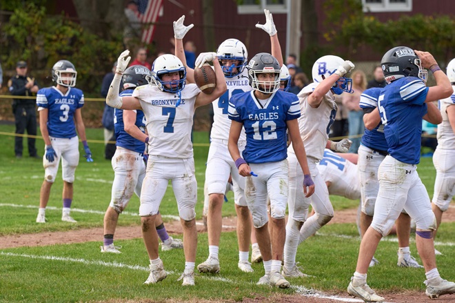 Nov. 8, 2023: The Bronxville football team is headed to the Class C Section 1 Championship after a 27-6 win over rival Dobbs Ferry at historic Gould Park last Saturday. In the other semifinal bracket, Westlake defeated Valhalla 21-6. Bronxville and Westlake will play at noon this Saturday at Arlington High School.