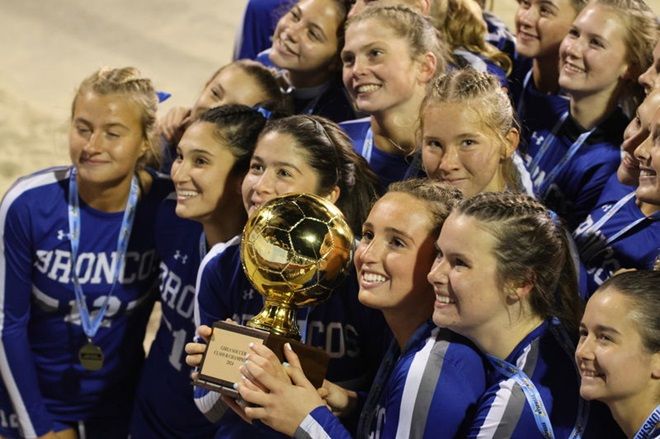 The girls’ soccer team celebrates after winning the Class B Section 1 Championship. Photo by Joe Villanueva.