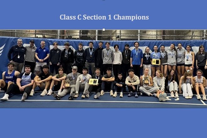 Feb. 19, 2025: The indoor track and field teams after winning their respective Section 1 Class C Championships on Sunday. Photo courtesy of @bxvboystrack.